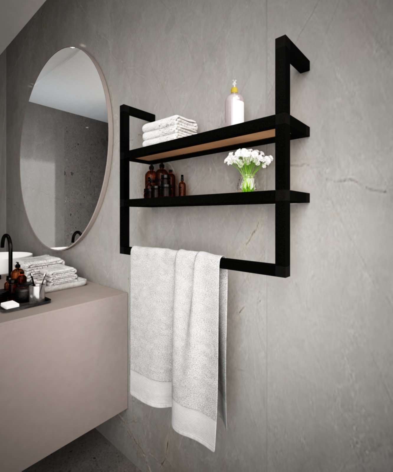 Upgrade your bathroom decor with our black metal wall shelf with towel rack.